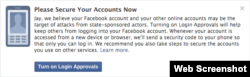 З 17 кастрычніка Facebook пастанавіў папярэджваць карыстальнікаў аб актыўнасьці, што нагадвае атаку «спансаваных дзяржавай актывістаў». Калі адміністрацыя западозрыць, што на акаўнт нацэленая атака дзяржаўных службаў, ці што акаўнт ужо ўзламаны, карыстальнік атрымае паведамленьне, што на настольнай вэрсіі сайту будзе мець такі выгляд: