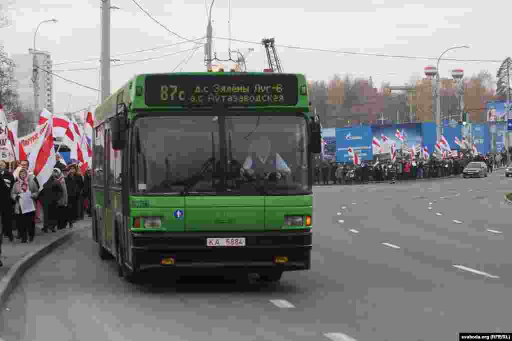 Удзельнікі шэсьця Дзяды вымушаныя прапускаць транспарт і пераходзіць дарогу асобнымі групамі. ДАІ не захацела перакрываць рух