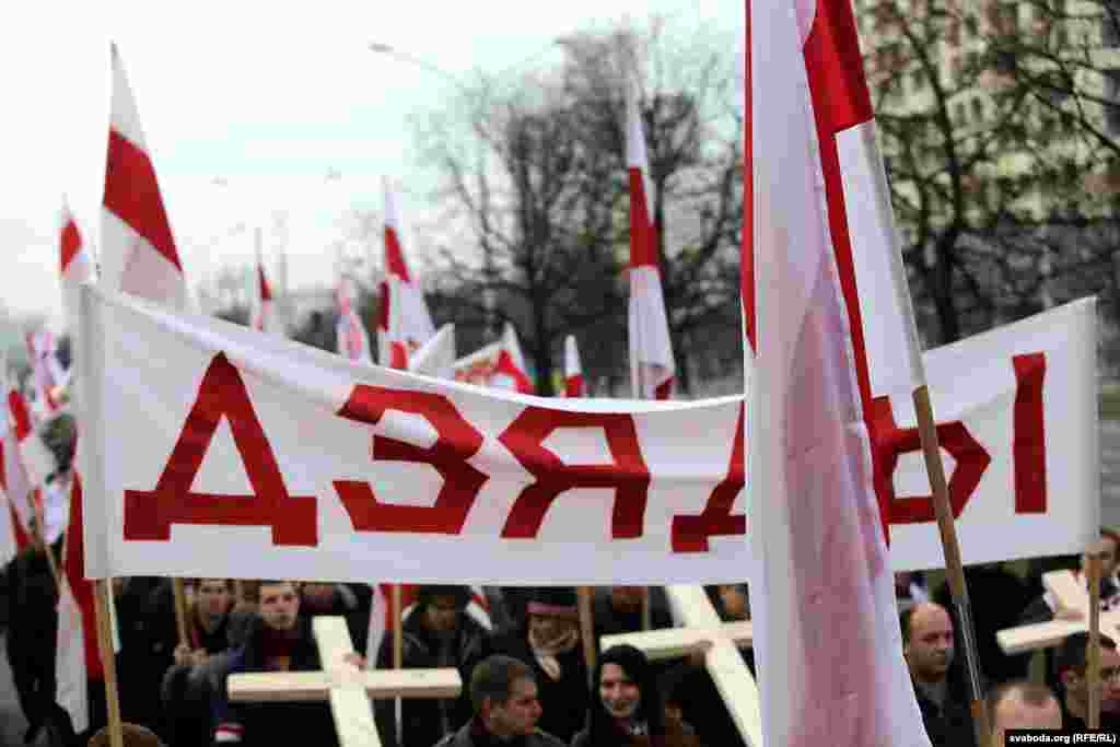 Удзельнікі шэсьця прынесьлі шмат бел-чырвона-белых сьцягоў