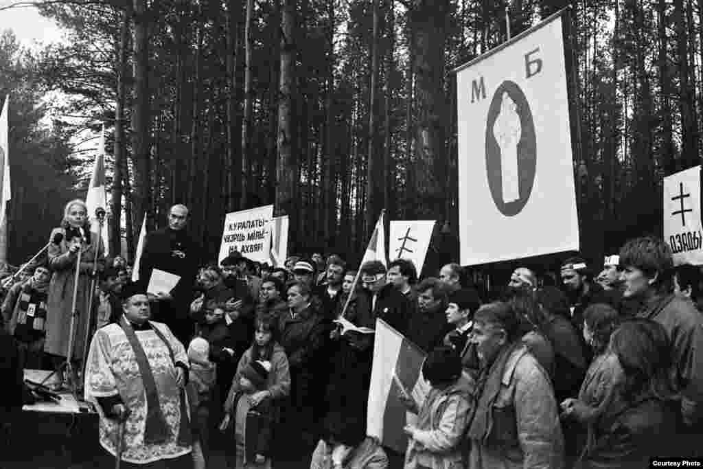 Сябры моладзевага аб’яднаньня «Талака» ўдзельнічаюць ва ўшанаваньні памяці продкаў на Дзяды. Курапаты, 1989 год. Архіўныя фота Ўладзіміра Сапагова.
