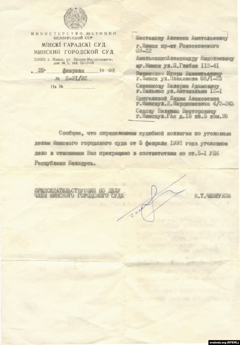 Валер Сядоў: «Ніякіх эмоцый — ня помню, каб я абрадаваўся. Добра, кажу. Далі мне даведку пра вызваленьне. Я ж ня ведаў, што тады вялізная колькасьць людзей стаялі каля Валадаркі і патрабавалі майго вызваленьня. Таму мяне на машыне завезьлі дахаты, паднялі мяне наверх і перадалі Ірыне».
