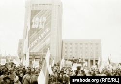 Валер Сядоў: «Адна з мэтаў мітынгу 7 лістапада 1990 году — шэсьце на плошчу Леніна да помніка яму. Мне адразу ў той момант згадаўся дзед, бабуля, мая мама пяцігадовая, якая стаіць на марозе ў сьнезе паўразьдзетая. Па бацьку дзед, які загінуў, каб выратаваць сям’ю ад рэпрэсіяў. Уся радня згадалася. Я зрабіў абвязаны калючым дротам крыж, на які была апранутая душагрэйка зэка ГУЛАГу. І мы ўсталявалі на помніку. Мы гэта зрабілі. Ад імя дзясяткаў мільёнаў рэпрэсаваных, і беларусаў у тым ліку».