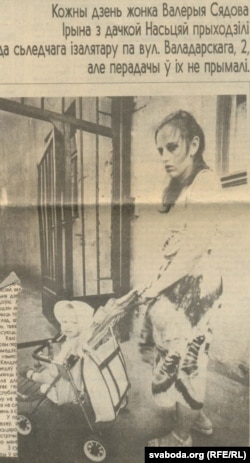 Ірына Логінава: «Я вось яшчэ пару месяцаў таму глядзела, як Мілана Міхалевіч з торбамі цяжкімі бегае ў «амэрыканку» туды. Вось я гэтаксама бегала, толькі на «Валадарку». Зь дзіцём, з вазком. Тады, праўда, трошкі іншыя былі правілы прыёму перадач. Але мне ўсё гэта знаёмае. Пасьля такі вось момант. Я чытала, як Ала Ўладзімераўна Саньнікава прынесла перадачу. Прычым, як я зразумела, яна старанна бегала перад днём народзінаў сына — нешта шукала прыемнае, каб парадаваць, а тут ёй — раз, і не прымаюць. А гэты шок я памятаю, мне давялося перажыць. Але гэты шок мне знаёмы, як я бегаю з Насьцяй па крамах, тэрмінова нешта зьбіраю ў гэтую перадачу, прыбягаю гэтую перадачу здаць — стаіць вялізная чарга, а я разумею, што я да абеду не пасьпею, у мяне дзіця — галоўнае. Усе праблемы той жа Міланы мне знаёмыя вельмі добра — ня ведаеш, куды бегчы. Я там, помню, нават расплакалася ў гэтай чарзе, але людзі мяне тут жа пусьцілі да вакенца. Я падаю перадачу — мне кажуць: «Не бяром!».