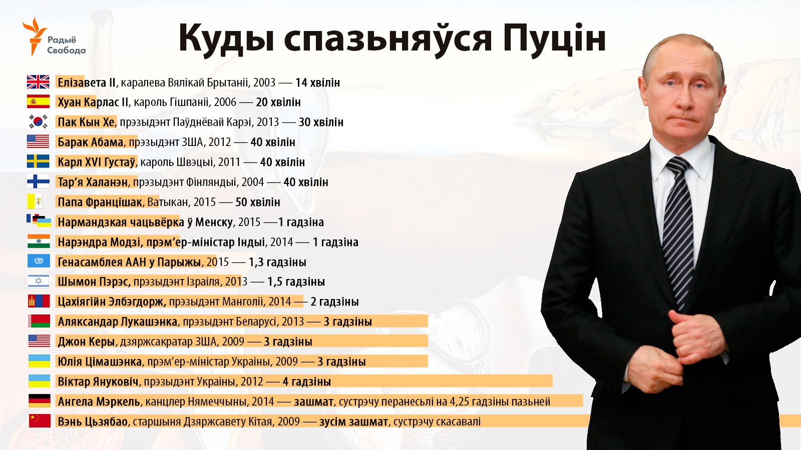 Так, аднойчы Аляксандру Лукашэнку давялося чакаць Пуціна тры гадзіны ў аэрапорце. Іншы раз Пуціна ў Менску з Лукашэнкам чакалі Франсуа Алянд, Ангела Мэркель і Пятро Парашэнка — але толькі гадзіну. Абсалютны зафіксаваны рэкорд Пуціна — спазьненьне на 4 гадзіны да Віктара Януковіча.