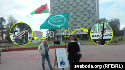 «Ёсьць таксама іншы фотаздымак гэтага пікету, дзе ёсьць бел-чырвона-белы сьцяг і чырвона-зялёны сьцяг, — кажа Свабодзе Андрэй Дзьмітрыеў. — Проста яны тады вывесілі чырвона-зялёны сьцяг і не пасьпелі яшчэ вывесіць бел-чырвона-белы, бо не знайшлі і паехалі купіць. Гэта была такая ініцыятыва кандыдата».