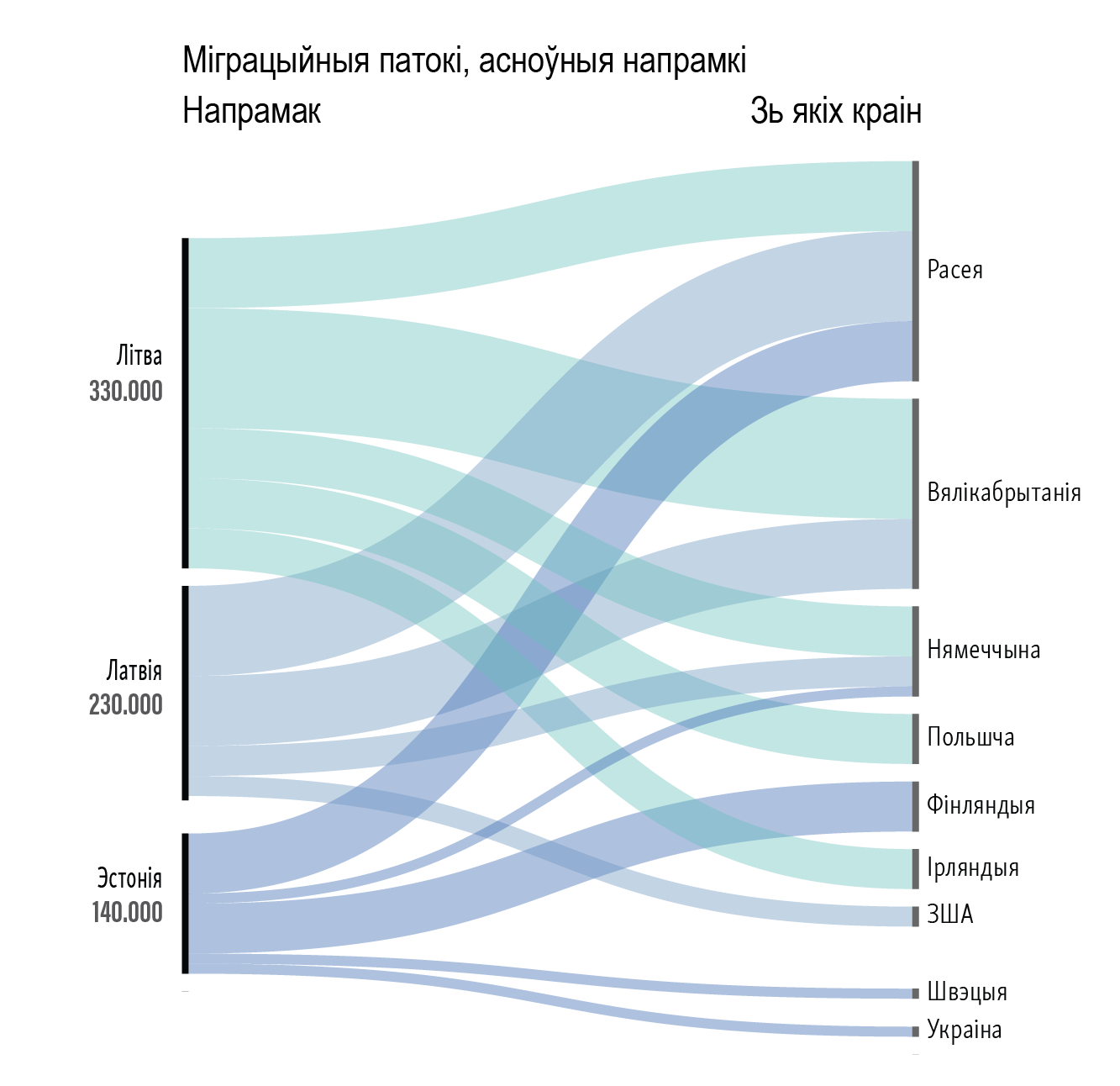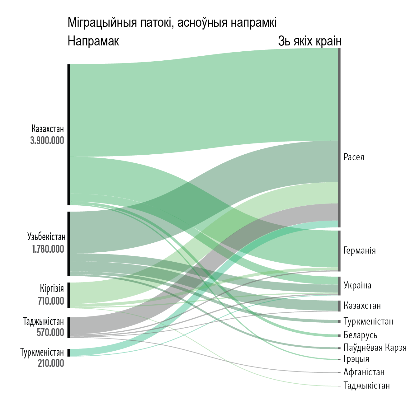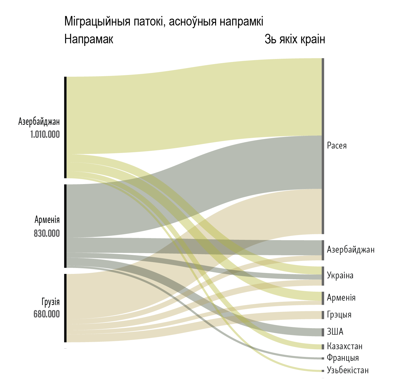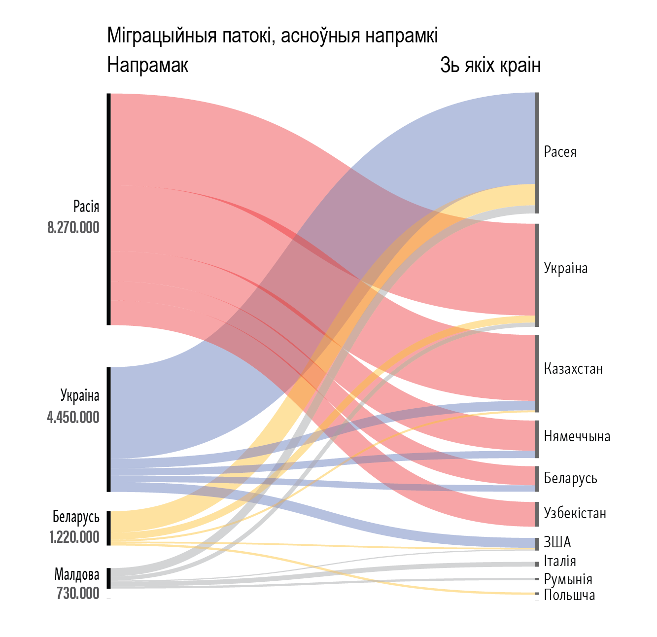 Асноўныя патокі мігрантаў з былых савецкіх рэспублік ідуць у Расею. Многія мігранты - расейцы, якія апынуліся за мяжой пасьля распаду СССР і спрабуюць узьяднацца з сваякамі. Астатнія едуць у Расею ў пошуках адукацыі і працы. Агульную мову і соцыякультурныя асаблівасьці робяць Расею пераважным выбарам для мігрантаў з былых савецкіх рэспублік, асабліва для ўкраінцаў: 3 млн украінцаў лічаць Расею сваёй радзімай. Эмігранты з краін Балтыі таксама аддаюць перавагу пераезду ў Расею, хоць многія абсталяваліся ў Ангельшчыне і Нямеччыне.