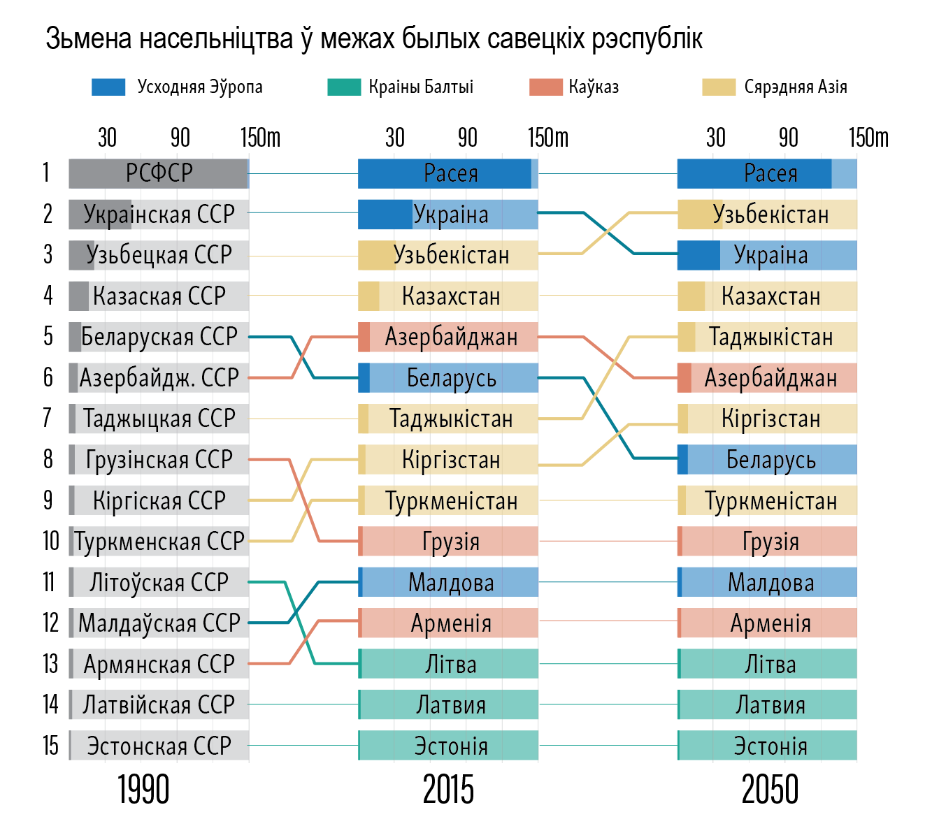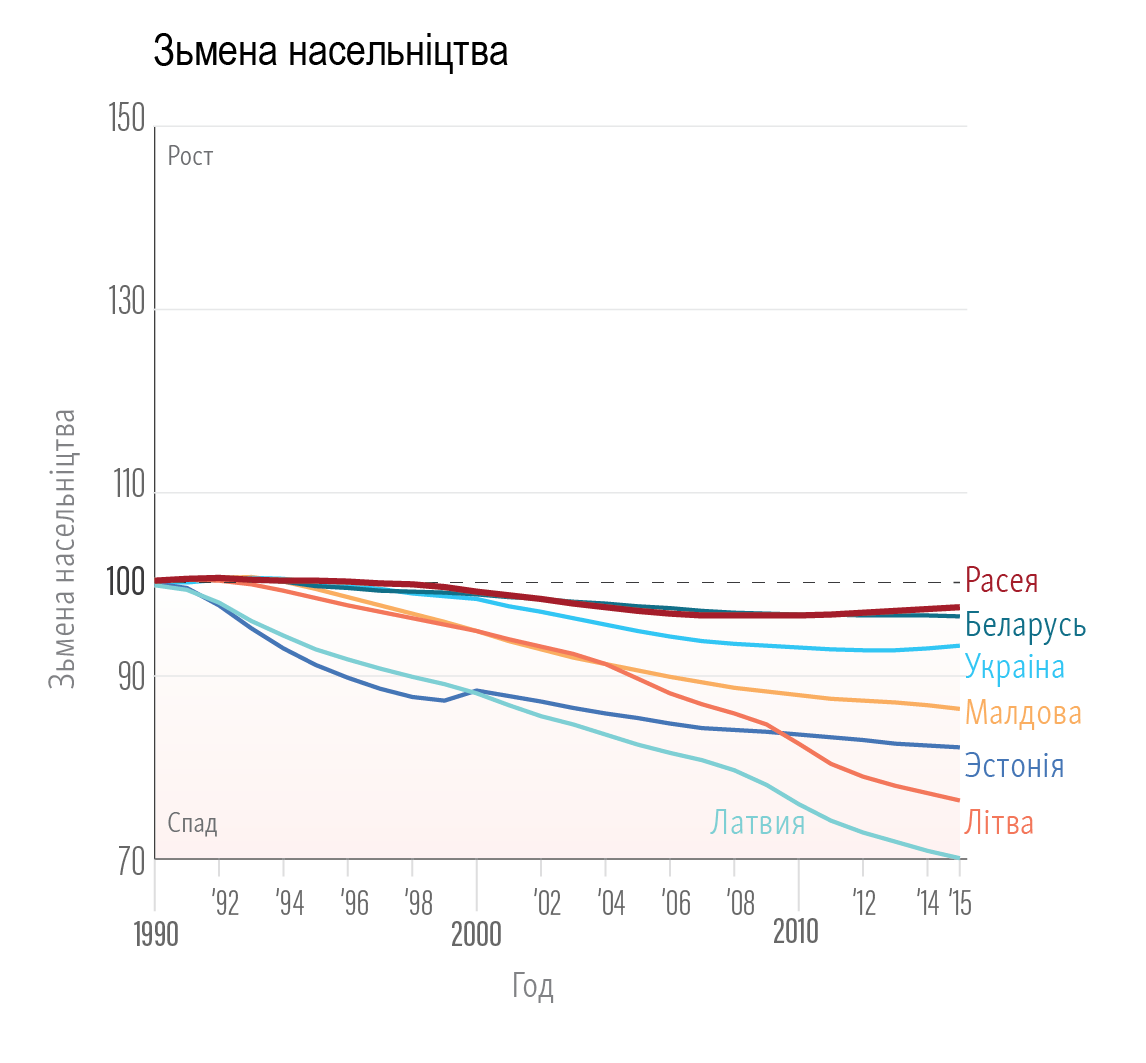 Украіна, дзе калісьці жылі 50 млн чалавек, хутчэй за ўсё сутыкнецца з вострай дэпапуляцыяй і паводле колькасьці насельніцтва на працягу 10 гадоў саступіць Узьбекістану. Іміграцыя маскіруе дэмаграфічны спад у Расеі, аднак яна ня здольная радыкальна зьмяніць агульны трэнд у постсавецкіх эўрапейскіх дзяржавах. Толькі Азербайджан і сярэднеазіяцкія краіны - галоўным чынам мусульманскія - змаглі бяз страт пераадолець дэмаграфічную яму, у якую трапілі астатнія рэспублікі былога Савецкага Саюзу.