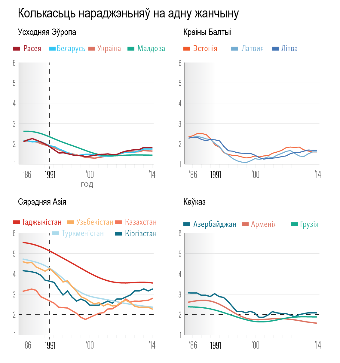 У 80-х гадах Савецкі Саюз праводзіў маштабныя кампаніі па заахвочваньні нараджальнасьці, аднак яны аказаліся эфэктыўнымі толькі ў кароткатэрміновай пэрспэктыве. Пасьля распаду СССР нараджальнасьць ва ўсіх постсавецкіх рэспубліках хутка зьнізілася. Многія дзяржаўныя дзіцячыя садкі былі зачыненыя або прыватызаваныя, што прывяло да істотнага падаражэньня догляду за дзіцем. З-за эканамічнай нестабільнасьці шматдзетныя сем'і сталі рэдкасьцю, паколькі кошт жыцьця рэзка ўзрос.