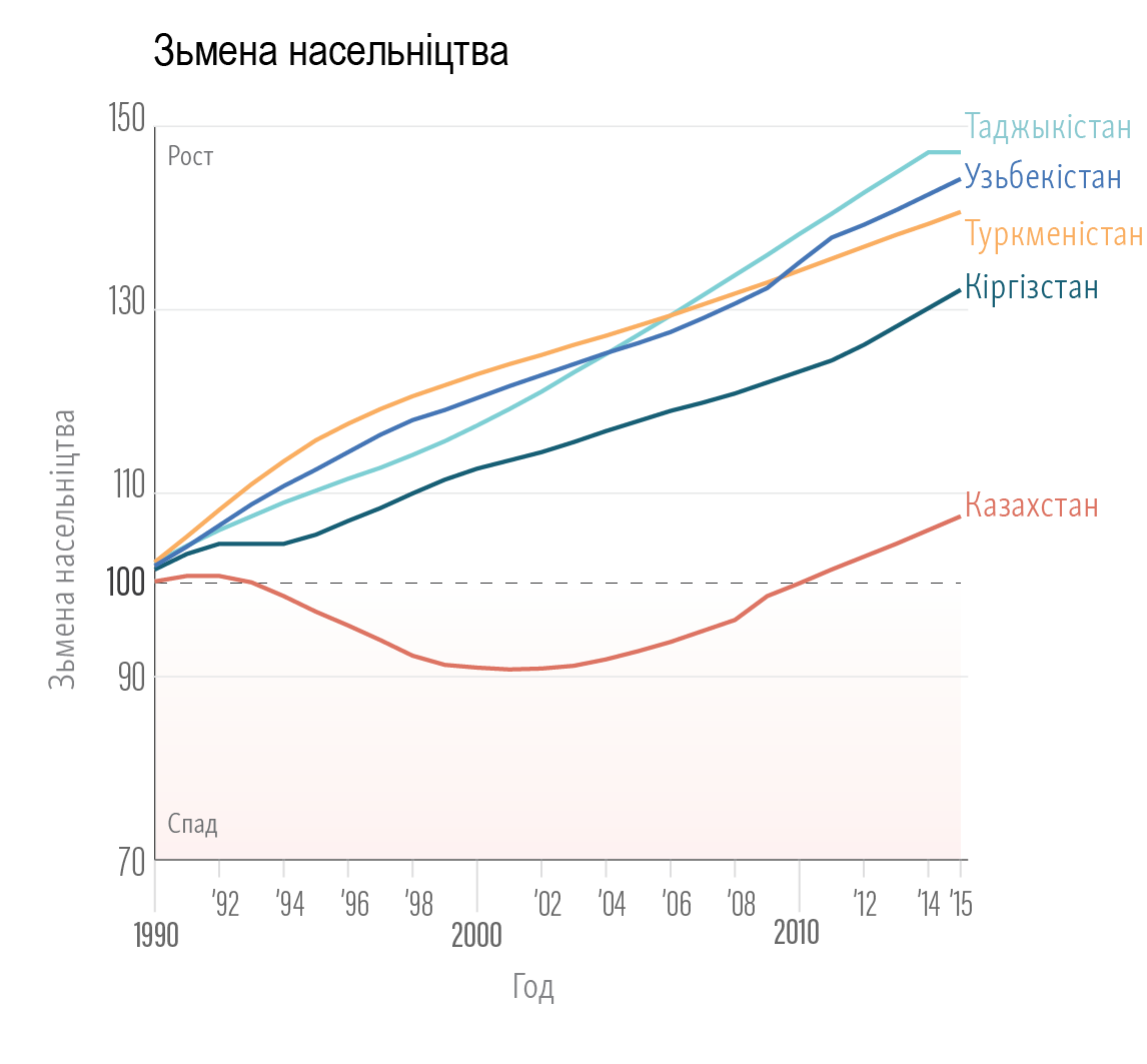 У Сярэдняй Азіі мы назіраем зусім іншую карціну. Кіргізстан, Таджыкістан і Узьбекістан перажываюць небывалы выбух нараджальнасьці. Насельніцтва Казахстану скарачалася больш за 10 гадоў - у асноўным з-за адтоку расейскага і нямецкага насельніцтва, аднак затым пачало расьці з-за павелічэньня нараджальнасьці.