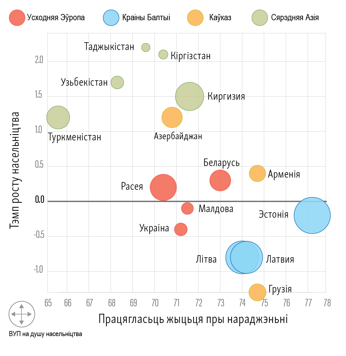 Працягласьць жыцця грамадзяніна Туркменістану, які нарадзіўся ў 2015 годзе, складае 65 гадоў; гэта на 10 гадоў менш, чым у Эстоніі. Працягласьць жыцьця на тэрыторыі былых савецкіх рэспублік моцна адрозьніваецца. Эстонія, Латвія і Літва - краіны Эўразьвязу і Шэнгенскай зоны - выйшлі ў лідэры па працягласьці жыцьця пры нараджэньні і ВУП на душу насельніцтва, пры гэтым там назіраецца рэзкі дэмаграфічны спад. Расея і краіны Ўсходняй Эўропы знаходзяцца пасярэдзіне. У Сярэдняй Азіі адносна нізкая працягласьць жыцьця на фоне высокага ўзроўню прыросту насельніцтва.