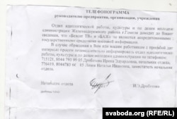 Падпісала тэлефанаграму начальніца аддзелу Ірына Дробатава і падала ажно чатыры тэлефоны, празь якія трэба «без прамаруджваньня інфармаваць» яе саму або намесьніцу Натальлю Лазьню.