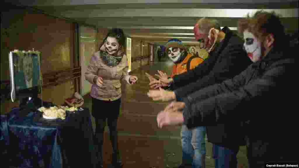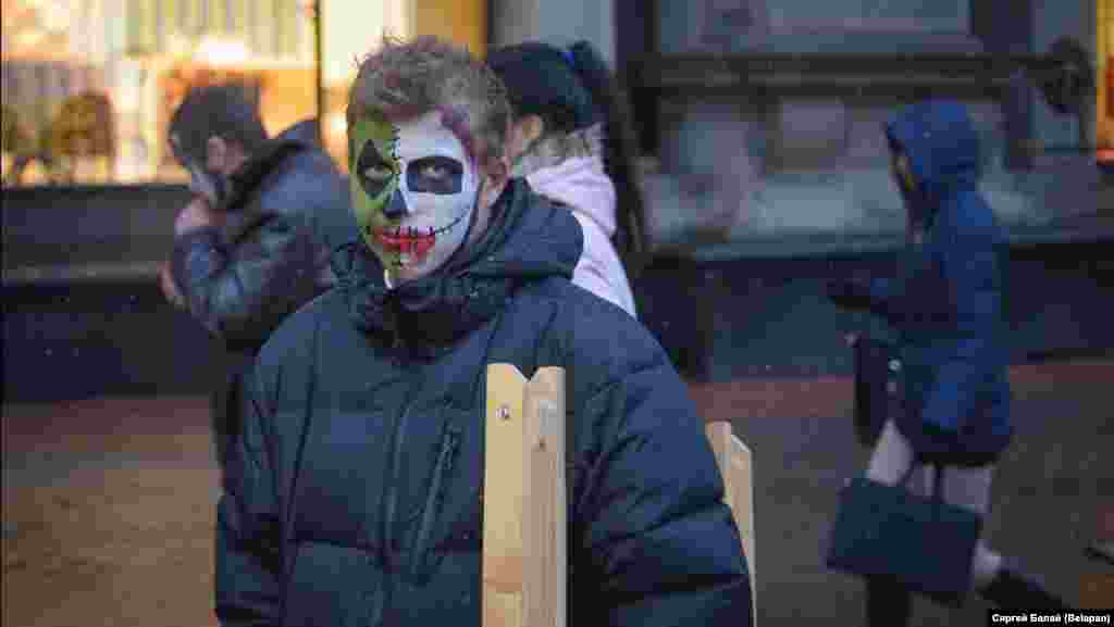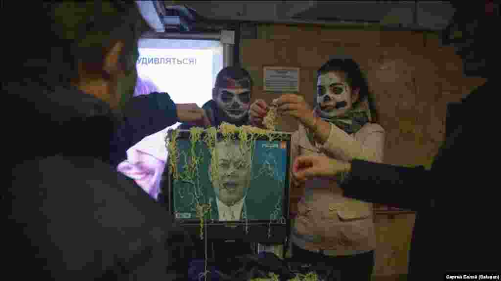 Каля 17:30 пяць чалавек з размаляванымі пад зомбі тварамі ўсталявалі ў падземным пераходзе каля ГУМа макет тэлевізара з партрэтам расейскага тэлевядучага Дзьмітрыя Кісялёва.