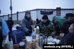 Пратэстоўцы напружана чакаюць будаўнічую тэхніку, зьбіраюцца замінаць яе праезду.