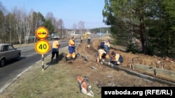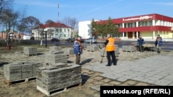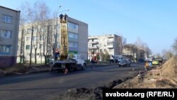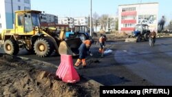 «Нам загадалі завяршыць усе вулічныя работы да 20 красавіка», — тлумачыць Аляксандар, дарожнік з Рэчыцы. Разам зь іншымі рэчыцкімі работнікамі ён парадкуе асфальт дарожнага кола на скрыжаваньні вуліц Кастрычніцкая і Батракова.