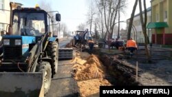 Далей па вуліцы Кастрычніцкай раўнуюць рыдлёўкамі асфальтную крошку дарожнікі з Буда-Кашалёва. Соўгаецца дарожная тэхніка ДРБУ-184.