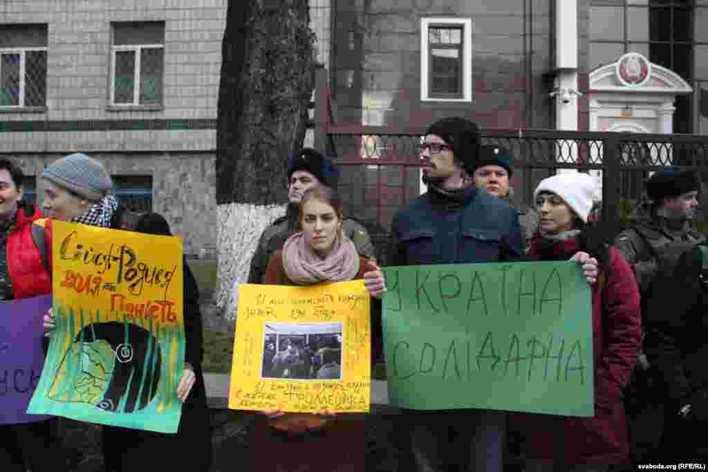 Былі тут і беларусы, якія вымушана жывуць у Кіеве. На акцыі прагучалі патрабаваньні да міжнародных структураў паўплываць на беларускую ўладу, і вызваліць палітзьняволеных.Таксама акцыі салідарнасьці адбыліся ў Харкаве ды Львове.