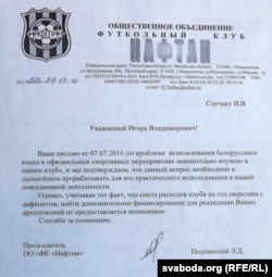 Таксама ў клюбе да апошняга часу парушаўся пункт 30 Інструкцыі па справаводзтве — афіцыйны блянк «Нафтану» быў толькі па-расейску. Наваполацкім гарвыканкамам было накіравана «пісьмовае указаньне аб неабходнасьці прывядзеньня формы блянка ліста, які выкарыстоўваецца ў дзейнасьці арганізацыі, у адпаведнасьці зь Інструкцыяй па справаводзтве», то бок дадаць яшчэ й беларускую мову.