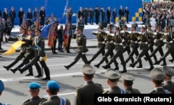 У адрозьненьне ад Менску, у парадзе ў Кіеве не было цяжкай вайсковай тэхнікі: баявая тэхніка была зьвезеная на асобную выставу.