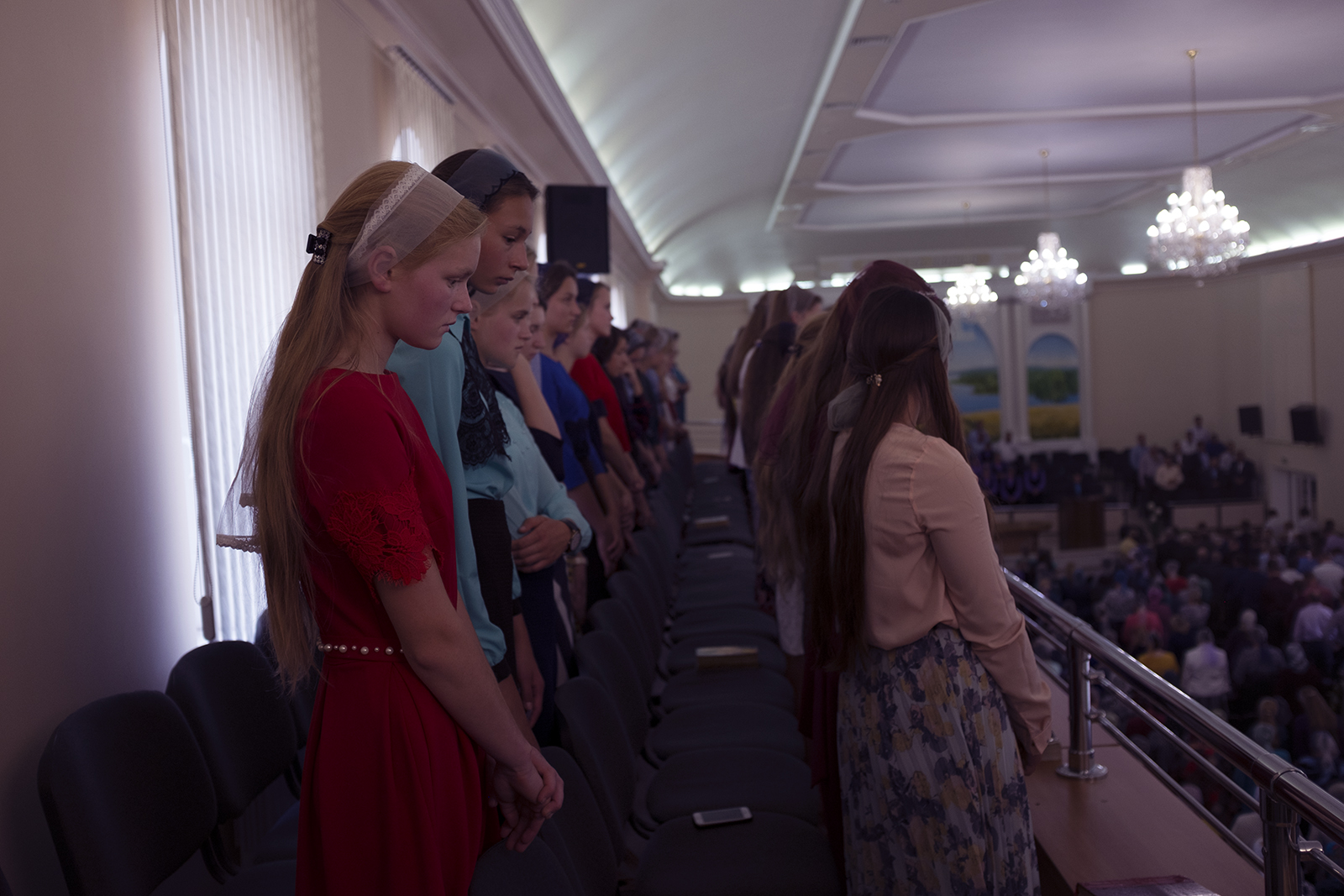 Адразу заўважныя два адрозьненьні ад менскіх пратэстанцкіх цэркваў: жанчыны хаваюць валасы пад хусткі ды сядзяць асобна ад мужчынаў — у левай частцы, як унізе, так і на бальконе.