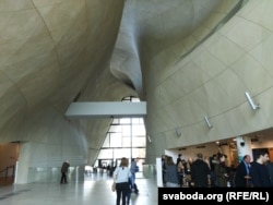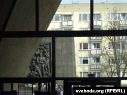 Адна сьцяна музэю зь вялізарным вакном глядзіць на помнік героям варшаўскага гета.