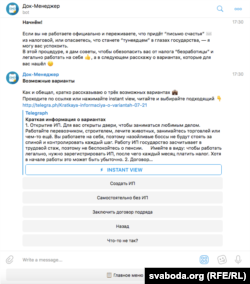 Ёсьць тут і опцыя «Як ня стаць дармаедам». Бот папярэджвае пра адказнасьць за неафіцыйную працу і прапануе адкрыць ІП, стаць рамесьнікам ці аформіць дамову падраду.
