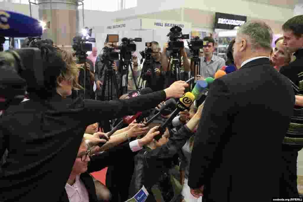 Намесьнік кіраўніка адміністрацыі Лукашэнкі Ўладзімер Жаўняк (зьлева) і міністар інфармацыі Аляксандар Карлюкевіч адкрываюць выставу