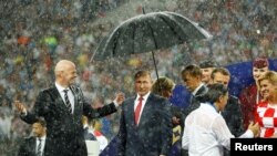 Падчас цырымоніі ўзнагароджаньня пасьля фінальнага матчу ЧС - 2018, якая адбывалася пад моцным дажджом, парасон доўгі час трымалі толькі над Уладзімірам Пуціным. Прэзыдэнты Францыі і Харватыі прамоклі да ніткі.
