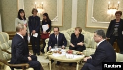 «А сёмай раніцы пасьля бяссоннай ночы Пуцін і надалей намагаўся перанесьці спыненьне агню на потым, — сьцьвярджае Алянд. — Каб мець вынік, мы скарысталі як аргумэнт ужо абвешчаныя антырасейскія санкцыі. Ён рабіў выгляд, быццам не разумее ці ня чуе, пра што мы. Урэшце ўзгаднілі, што спыненьне агню наступіць праз чатыры дні, затым — адвод цяжкіх узбраеньняў і абмен палоннымі. Аўтаномію правінцыяў адхілілі.