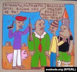Але народ хоча большага: ваеннаабавязаныя Саша і Сірожа, народныя героі мастака Аляксея Хацкевіча, заяўляюць, што аўтаматамі ды пісталетамі сёньня не абыдзесься. «Выдайце людзям ракеты! Паваююем мы тагда!».