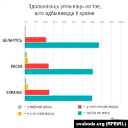 «У Беларусі ўсё, што зьвязана з публічным выказваньнем сваёй пазыцыі, набірае меншы працэнт у параўнаньні з адказамі расейскіх і ўкраінскіх рэспандэнтаў», — пішуць аўтары дасьледаваньня.