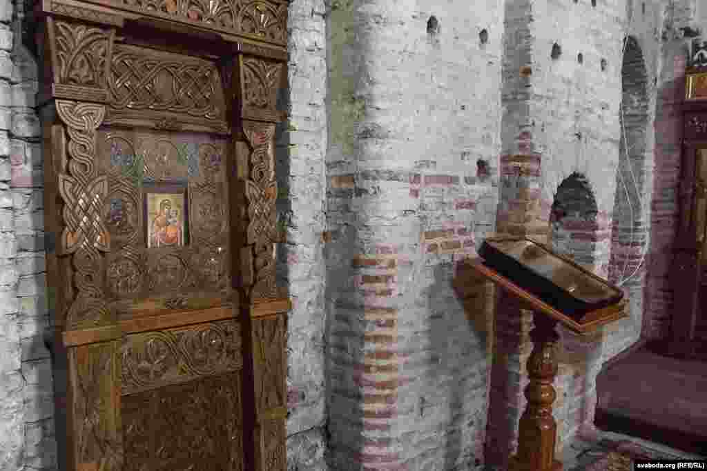 Унутры драўляную сьцяну (справа) таксама парамантавалі, патынкавалі