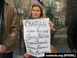Удзельнікі пікету трымалі плякат з надпісам «Свабоду палітвязьням», а таксама сьпіс затрыманых у Беларусі актывістаў.