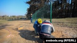 З раніцы 5 красавіка рабочыя з Заслаўя працягваюць ставіць агароджу па пэрымэтры Курапатаў, больш крыжоў ня валяць.