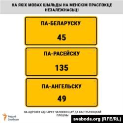 І нават ангельскамоўных шыльдаў у Менску больш. Карэспандэнт Свабоды падлічыў шыльды на розных мовах на сталічным праспэкце Незалежнасьці ад парку Чалюскінцаў да Кастрычніцкай плошчы.