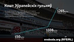 Столькі грошай пайшло на арганізацыі і правядзеньне Эўрагульняў. Лічбу агучыў міністар фінансаў Беларусі Максім Ермаловіч. Бюджэтныя сродкі з гэтага — 133 мільёны, астатняе — спонсарская дапамога. За 270 мільёнаў можна было б пабудаваць: