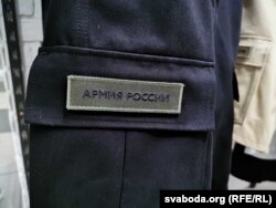 Адзеньне з надпісам «Армія Расеі» і «Вырашу адным мігам» з партрэтам прэзыдэнта Расеі Ўладзіміра Пуціна прадаецца ў цэнтры Менску ў краме пад брэндам расейскага рэпэра Цімаці.