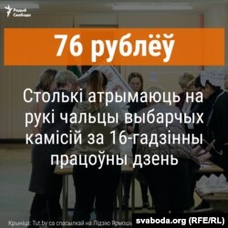 За 16-гадзінны працоўны дзень выбараў шараговыя чальцы камісіяў атрымаюць на рукі каля 76 рублёў па двайной стаўцы, сказала Ярмошына. Гэта 4,75 рубля за гадзіну. Абед для шараговых чальцоў выбарчай камісіі не прадугледжаны.