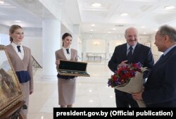 Лукашэнка падарыў Бакіеву карціну «Паляваньне качэўнікаў зь беркутам», корцік і букет кветак.