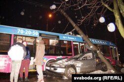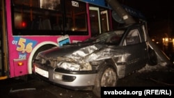 Разьбіты аўтамабіль літаральна ператварыўся ў груду мэталу, але кіроўца і ягоныя пасажыры — усе маладыя хлопцы — цудам засталіся цэлымі. Кіроўца ня можа патлумачыць, што здарылася — паводле яго, аўтамабіль пачаў сьлізгаць па праезнай частцы, пасьля таго, як ён затармазіў на скрыжаваньні. Такім чынам легкавік стукнуўся ў машыну, якая рухалася ўперадзе, затым яго разьвярнула і занесла пад тралейбус. Аварыя здарылася падчас дажджу, дарога сапраўды была сьлізкай.