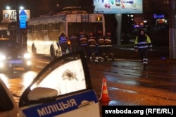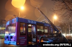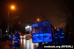 Іншы тралейбус, які стаў на перакрыжаваньні ў сувязі з абарванай лініяй, супрацоўнікі Міністэрства ў надзвычайных справах адкацілі да прыпынку.