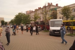 На скрыжаваньні вуліц Леніна і Замкавай перакрылі дарогу. Людзі ідуць уверх да плошчы Перамогі.
