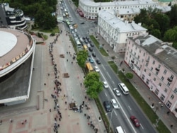 Жыхары Гомля 28 траўня выстраіліся ў чаргу, каб пакінуць подпіс за Сьвятлану Ціханоўскую, якая вылучаецца кандыдатам на прэзыдэнта.