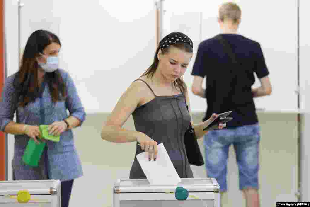 Днём 9 жніўня перад школай № 41, што на вуліцы Алеся Гаруна ў менскім мікрараёне Дамброўка, утварыліся чэргі выбарнікаў. На ўчастку кабінкі закрытыя толькі з трох бакоў, шторак няма.