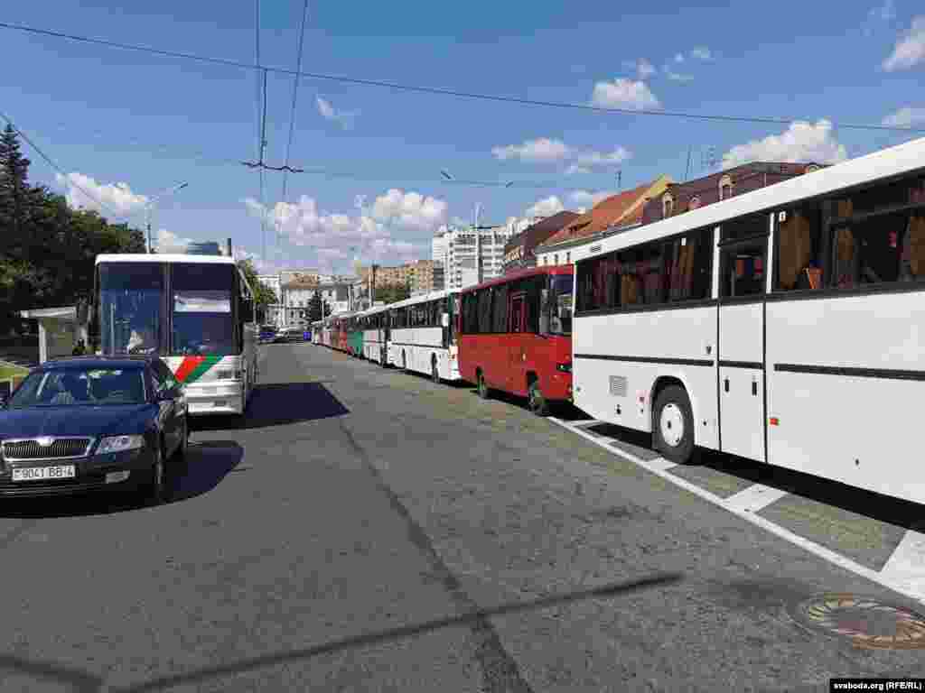 На плошчы Незалежнасьці ў Менску некалькі сотняў чалавек, якія прыбылі на мітынг у падтрымку Аляксандра Лукашэнкі. Дзясяткі аўтобусаў з розных абласьцей стаяць у прылеглых вуліцах.