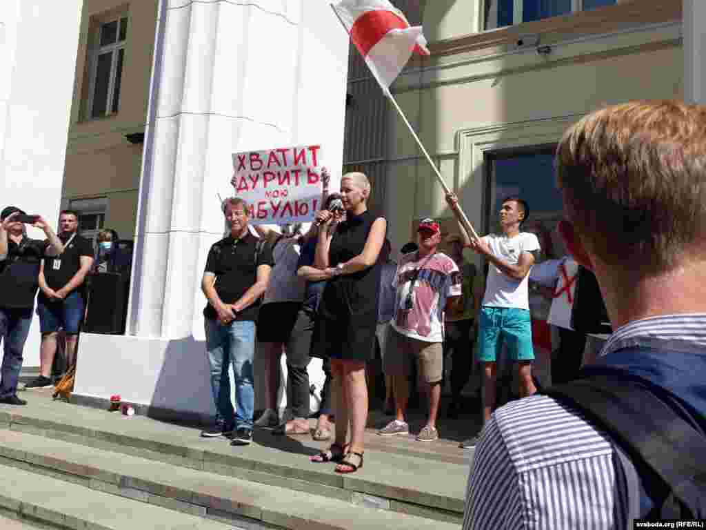 Тут выступіла Марыя Калесьнікава. Яна сказала пра салідарнасьць і стварэньне каардынацыйнага камітэту, у які могуць увайсьці прадстаўнікі прадпрыемстваў.
