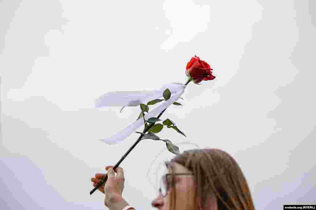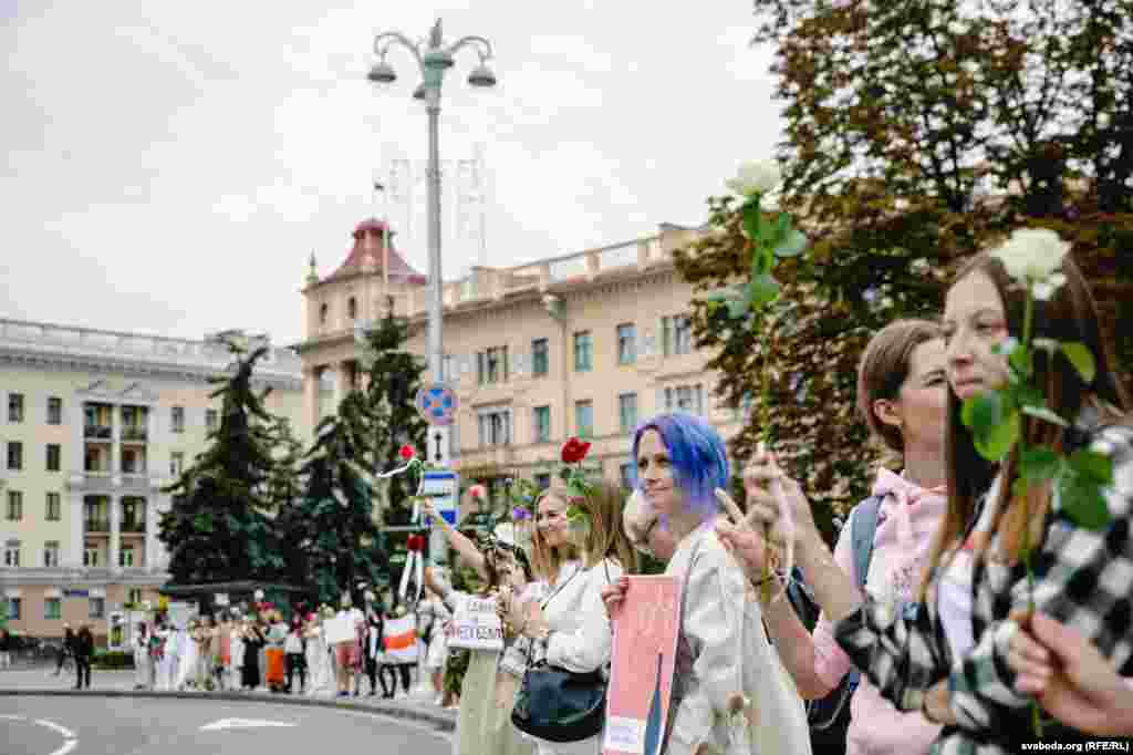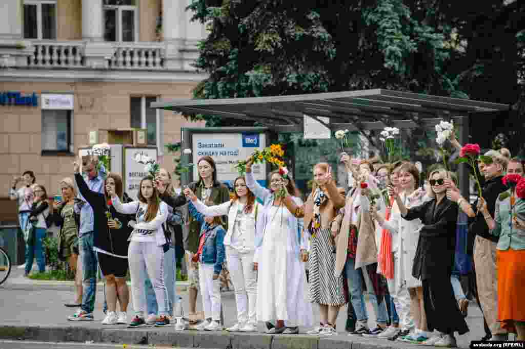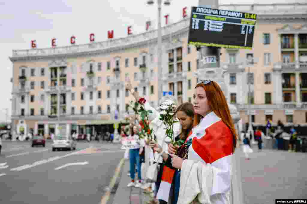 Людзі сталі ў «ланцуг салідарнасьці» на плошчы Перамогі ў Менску. Фотарэпартаж