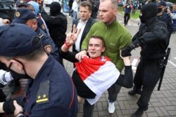 12:07 Каля галоўнага корпусу БДУ людзі ў чорным і ў вайсковай форме затрымалі і зьбівалі людзей.