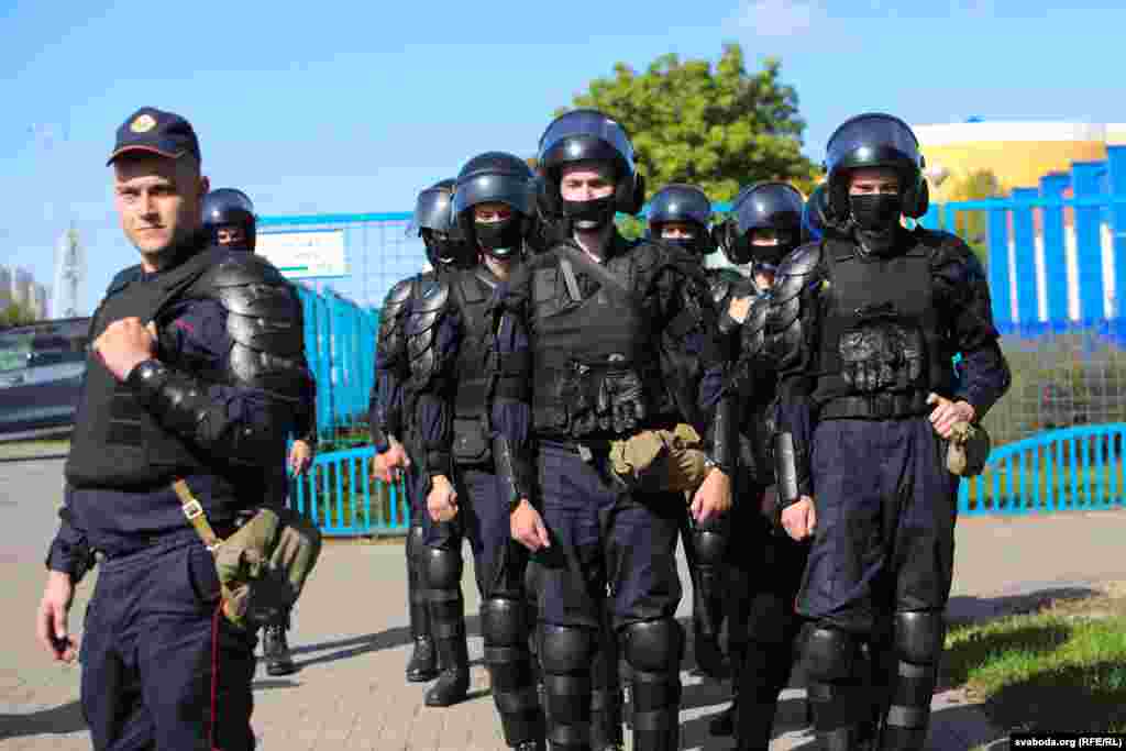 Кастрычніцкую плошчу па ўсім пэрымэтры абнесьлі мэталічнай агароджай, за якой групамі стаяць дзясяткі экіпаваных байцоў унутраных войскаў з аўтаматамі