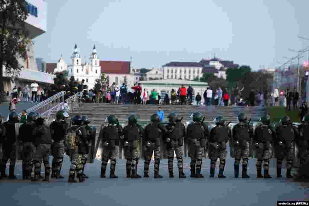 Пасьля 19-й гадзіны ля стэлы зьявіліся дзясяткі аўтазакаў, міліцэйскіх аўтобусаў і вадамётаў