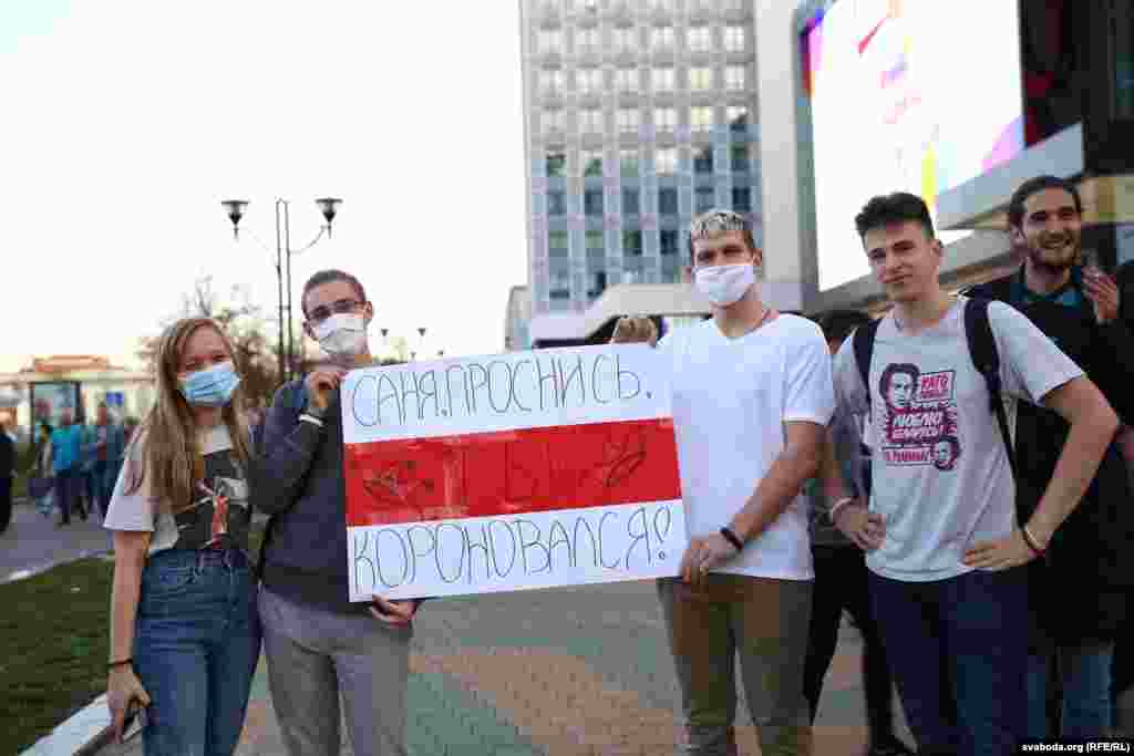 Сотні чалавек рушылі па праспэкце Пераможцаў у накірунку стэлы. Карона — папулярны аксэсуар